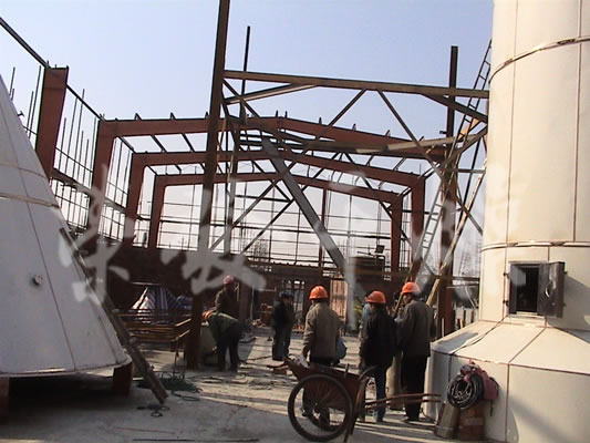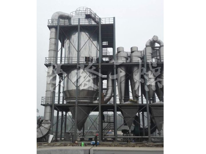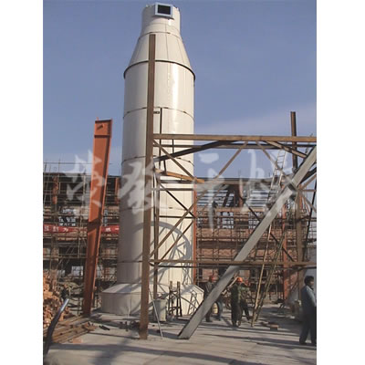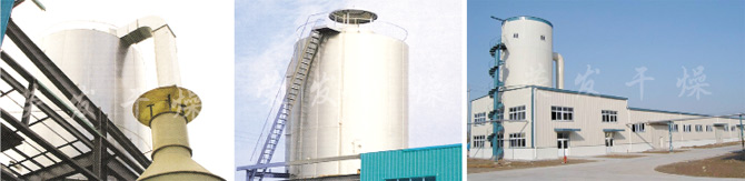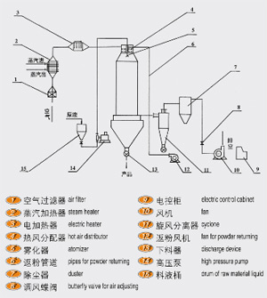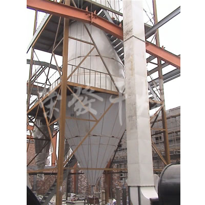 本機(jī)組工作過(guò)程為料液通過(guò)隔膜泵高壓輸入,噴出霧狀液滴,然后同熱空氣并流下降,大部分粉粒由塔底排料口收集,廢氣及其微小粉末經(jīng)旋風(fēng)分離器分離,廢氣由抽風(fēng)機(jī)排出,粉末由設(shè)在旋風(fēng)分離器下端的授粉筒收集,風(fēng)機(jī)出口還可裝備二級(jí)除塵裝置,回收率在96-98%以上。