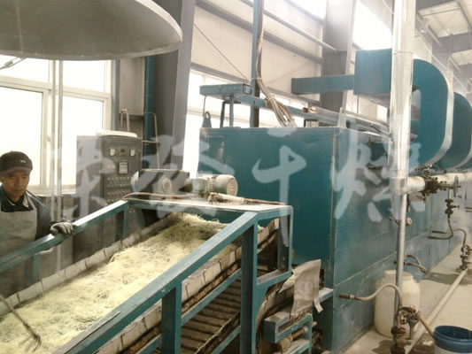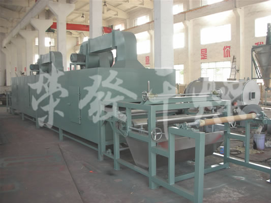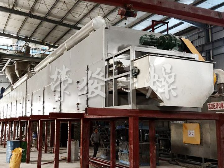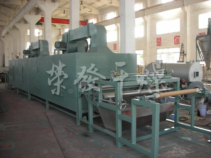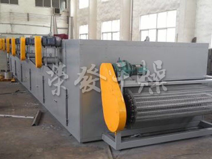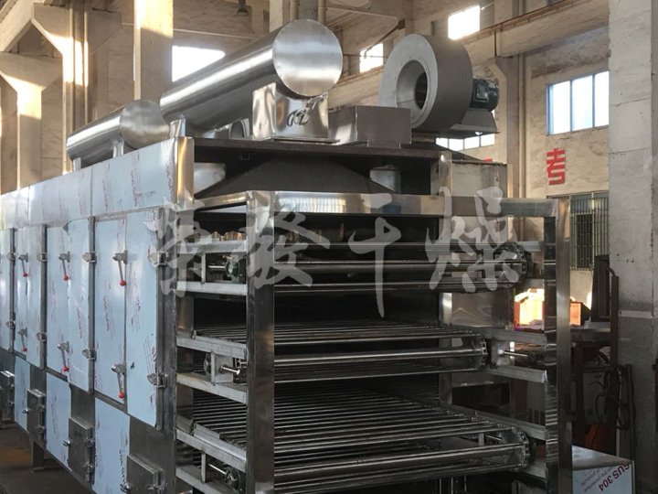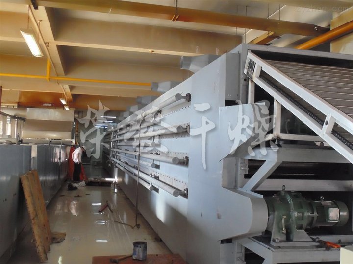物料由加料器均勻地鋪在網(wǎng)帶上,網(wǎng)帶一般采用12-60目不銹鋼絲網(wǎng),由傳動裝置拖動在干燥機內(nèi)移動。干燥機由若干單元組成,每一單元熱風獨立循環(huán),部分尾氣由專門排濕風機排出,廢氣由調(diào)節(jié)閥控制,熱氣由下往上或由上往下穿過鋪滿物料的網(wǎng)帶完成熱量與質(zhì)量傳遞的進程,帶走物料水份。網(wǎng)帶緩慢移動,運行速度可根據(jù)物料溫度自由調(diào)節(jié),干燥后的成品連續(xù)落入收料器中。上下循環(huán)單元根據(jù)用戶需要可靈活配備,單元數(shù)量亦可根據(jù)需要選取。