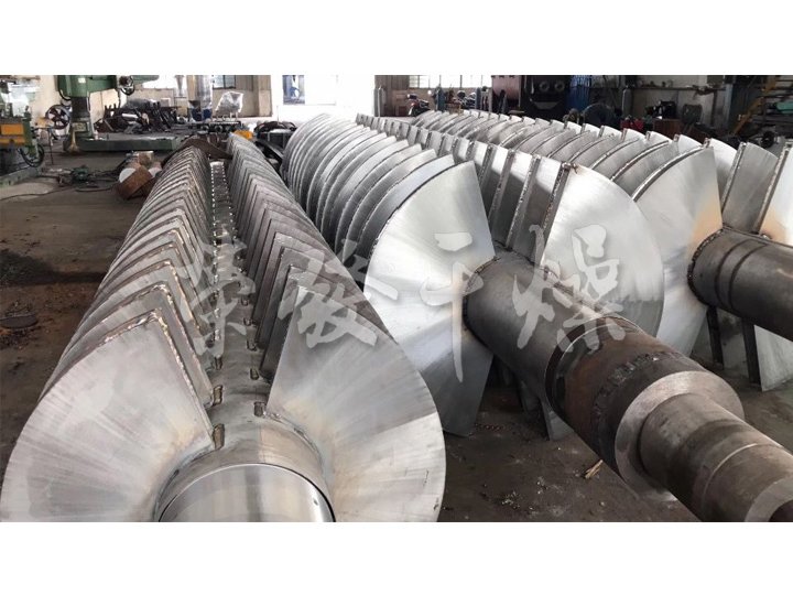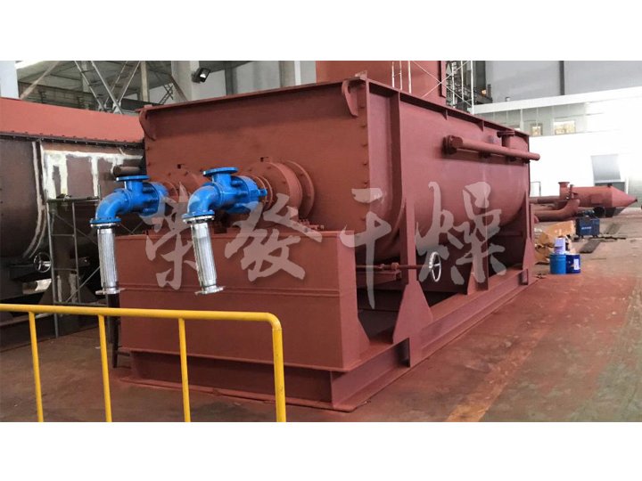 空心軸上密集排列著楔型中空漿葉,熱介質(zhì)經(jīng)空心軸流經(jīng)漿葉。單位有效容積內(nèi)傳熱面積很大,熱介質(zhì)溫度從-40℃到320℃,可以是水蒸汽,也可以是液體型:如熱水、導(dǎo)熱油等。間接傳導(dǎo)加熱,沒(méi)有攜帶空氣帶走熱量,熱量均用來(lái)加熱物料。熱量損失僅為通過(guò)器體保溫層向環(huán)境的散熱。楔型漿葉傳熱面具有自清潔功能。物料顆粒與楔型面的相對(duì)運(yùn)動(dòng)產(chǎn)生洗刷作用,能夠洗刷掉楔型面上附著物料,使運(yùn)轉(zhuǎn)中一直保持著清潔的傳熱面。漿葉干燥機(jī)的殼體為Ω型,殼體內(nèi)一般安排二到四根空心攪拌軸。殼體有密封端蓋與上蓋,防止物料粉塵外泄而充分發(fā)揮作用。