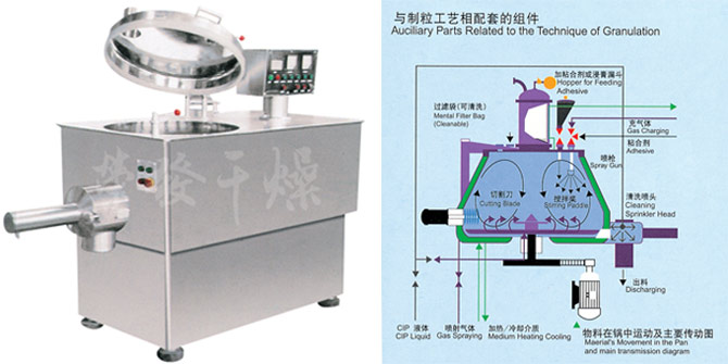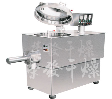粉體物料與粘合劑在圓筒形容器中由底部混合漿充分混合成濕潤(rùn)軟材,然后由側(cè)置的高速粉碎槳切割成均勻的濕顆粒。