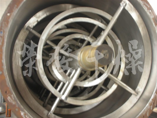 該機(jī)型由容器、螺旋攪拌葉片和傳動部件組成:螺旋葉片一般做成雙層或三層,外層螺旋將物料從兩側(cè)向中央?yún)R集,內(nèi)層螺旋將物料從中央兩側(cè)輸送,形成對流混合。