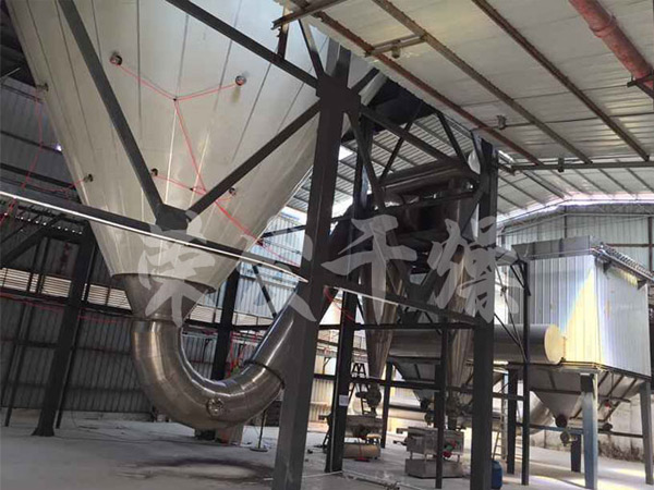 空氣經(jīng)過濾和加熱,進(jìn)入干燥器頂部空氣分配器,熱空氣呈螺旋狀均勻地進(jìn)入干燥室。料液經(jīng)塔體頂部的高速離心霧化器,(旋轉(zhuǎn))噴霧成極細(xì)微的霧狀液珠,與熱空氣并流接觸在極短的時(shí)間內(nèi)可干燥為成品。成品連續(xù)地由干燥塔底部和旋風(fēng)分離器中輸出,廢氣由風(fēng)機(jī)排空。