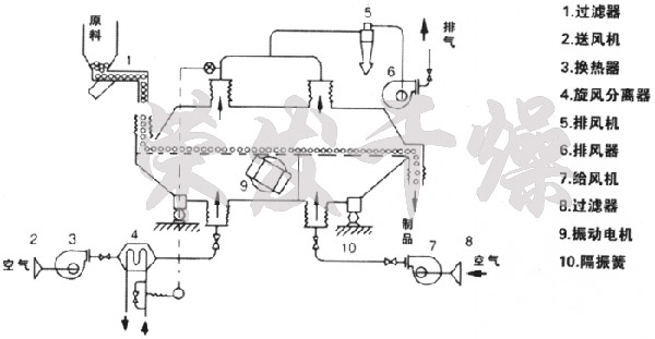 亞氨基二乙腈專用振動流化床干燥機干燥系統(tǒng)主要包括鼓風機、空氣加熱器、振動流化床、旋風收集器、袋式除塵器、引風機、排氣筒等設備。 經(jīng)過加熱后的潔凈干燥的熱空氣經(jīng)分配后進入流化床,從加料口進入的濕物料被熱風吹起從而形成沸騰狀態(tài)。由于熱風與物料廣泛接觸,增強了傳熱傳質(zhì)的過程,因此在較短的時間內(nèi)就可干燥,潮濕的廢氣由風機排出,干燥后的物料經(jīng)過自然空氣進行冷卻,從而利于包裝。