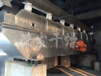 物料自進(jìn)料進(jìn)口進(jìn)入機(jī)內(nèi),在振動(dòng)力作用下,物料沿水平面流化床拋擲,向前連續(xù)運(yùn)動(dòng),熱風(fēng)向上穿過流化床同濕物料換熱后,濕空氣經(jīng)旋風(fēng)分離器除塵后由排風(fēng)1:3排出.干燥物料由排料進(jìn)口排出。